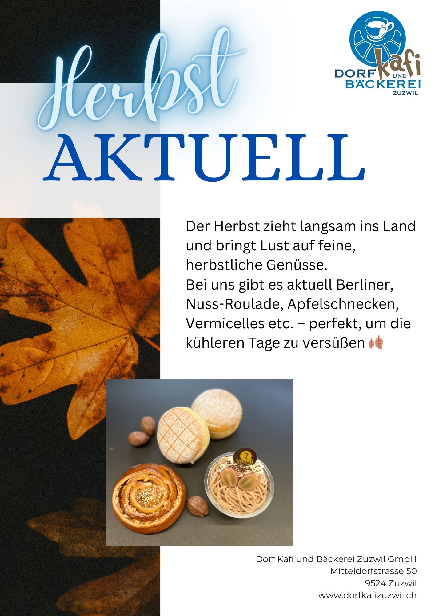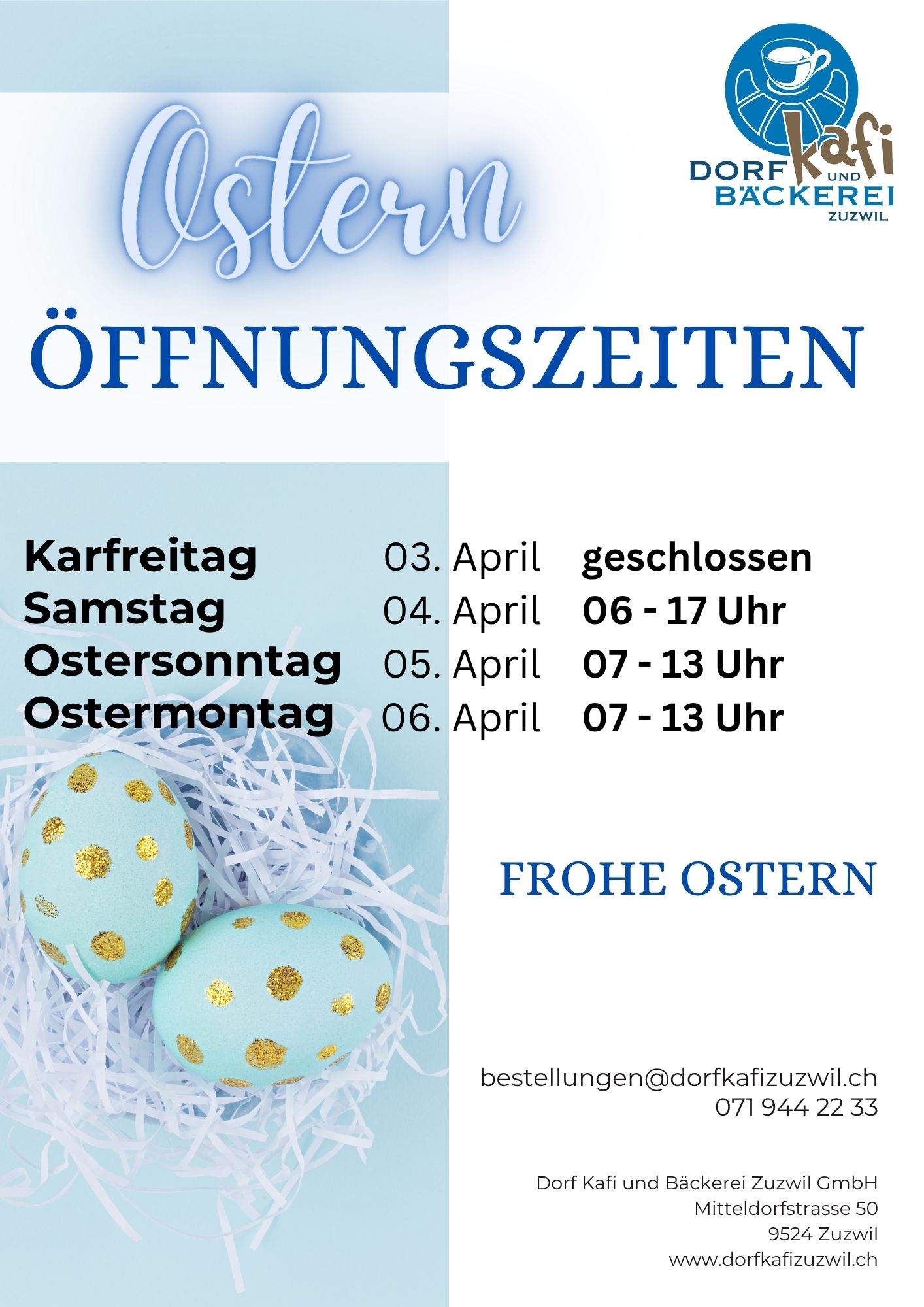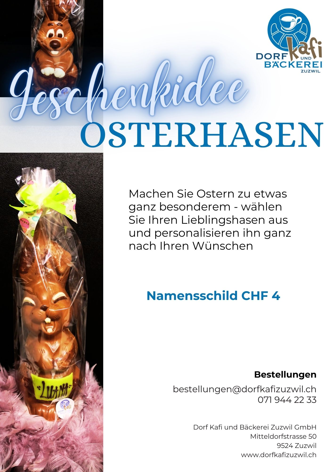 Per E-Mail: bestellungen@dorfkafizuzwil.ch oder telefonisch +41 71 944 22 33