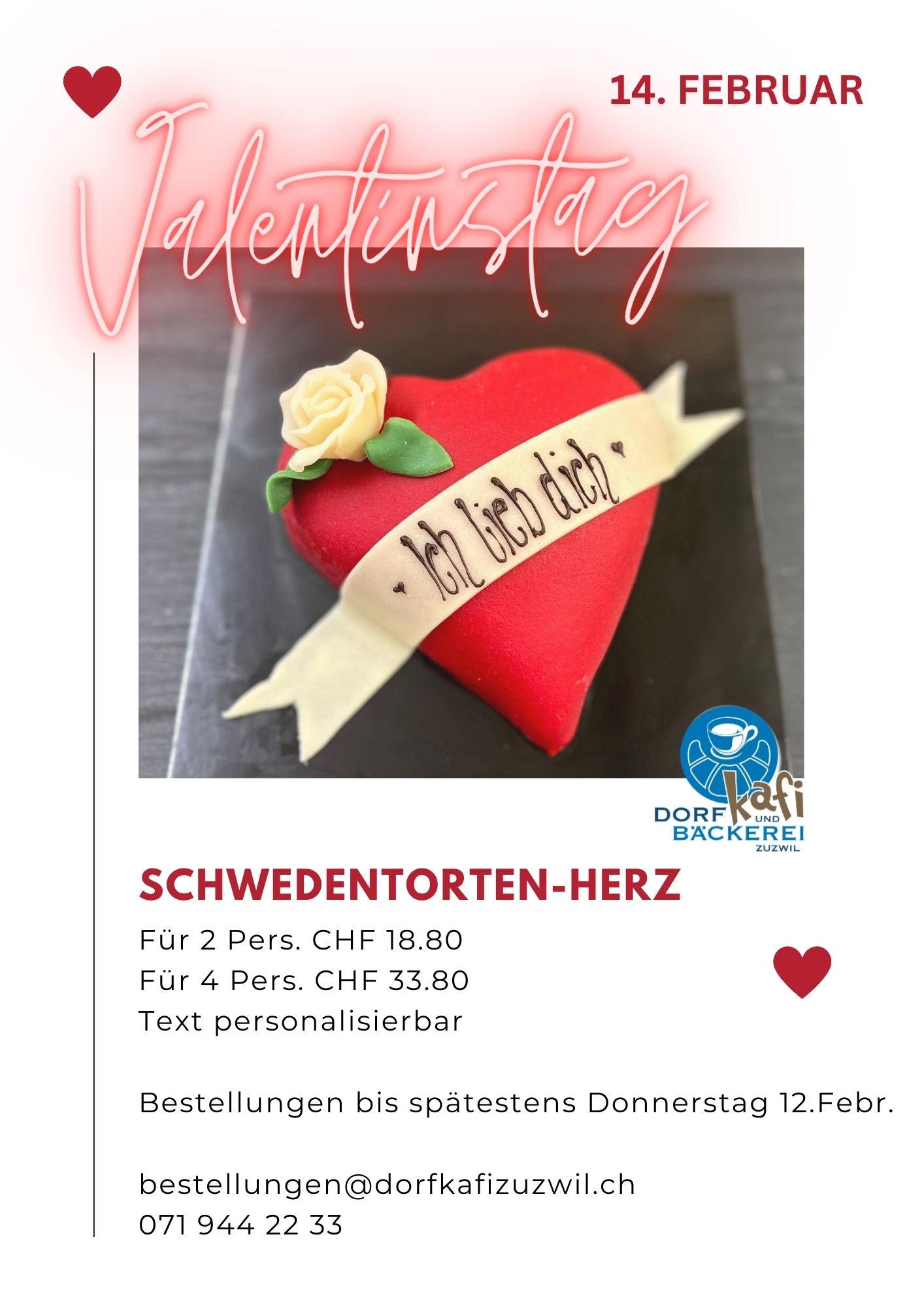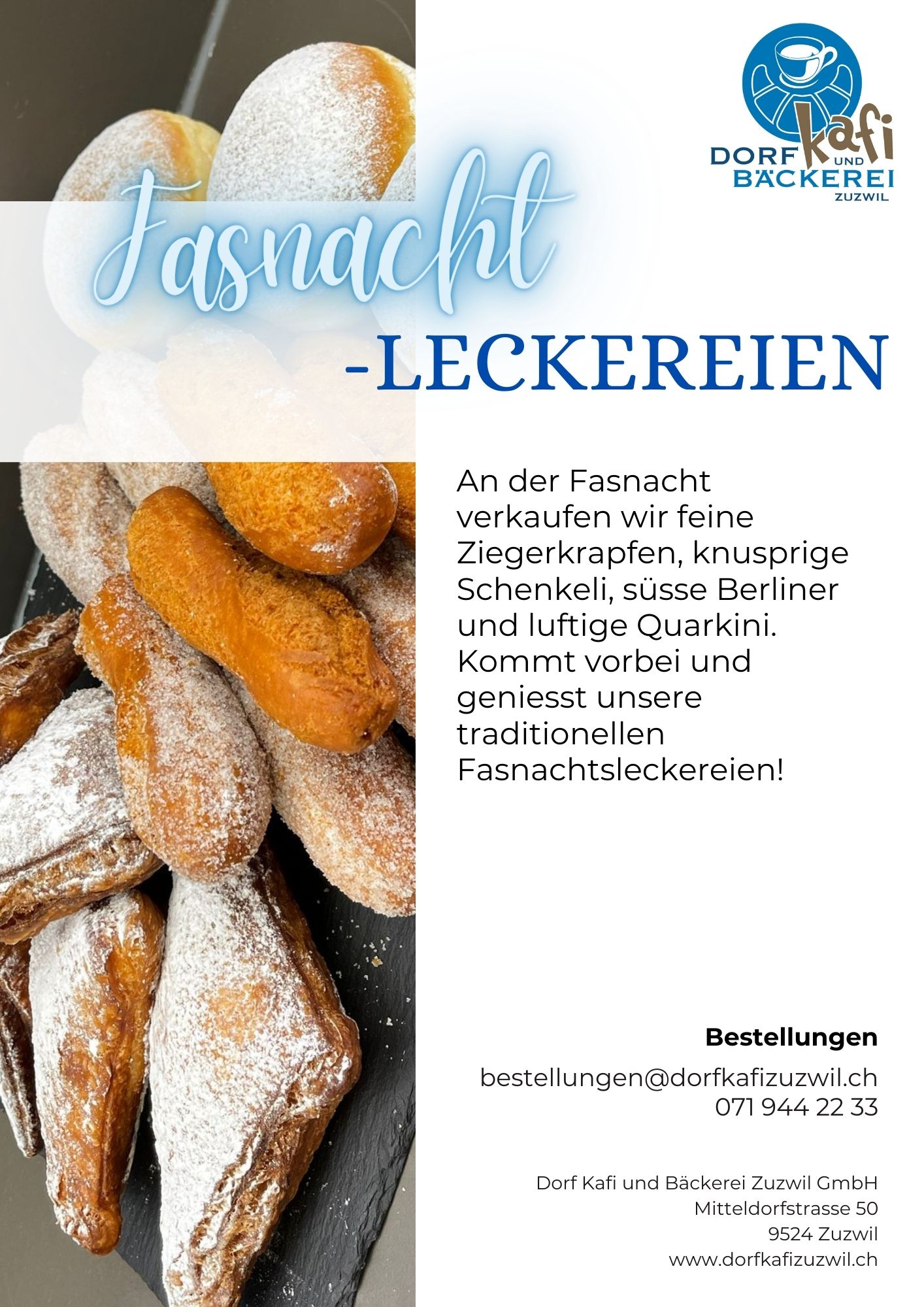 Per E-Mail: bestellungen@dorfkafizuzwil.ch oder telefonisch +41 71 944 22 33